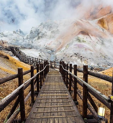 Aujourd'hui, direction la ville de Noboribetsu à environ 1h15 de train, pour vous prélasser dans un onsen et être au contact de la nature en suivant le sentier balisé de la vallée de l'enfer Jigokudani. Son paysage lunaire, ses odeurs de souffre du lac d’Oyunuma.